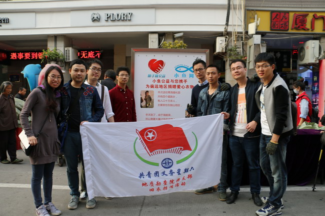 2015年11月29日下午,在中山路来雅百货门前的旧衣物接收点,队属地勘院、测绘院团员青年志愿者早早来到现场,按性别进行分工,女的主要负责现场衣服的整理、分类与打包,男的主要派送捐赠的旧衣物到现物,然后将打包好的衣物搬运至运输车辆或者仓库。