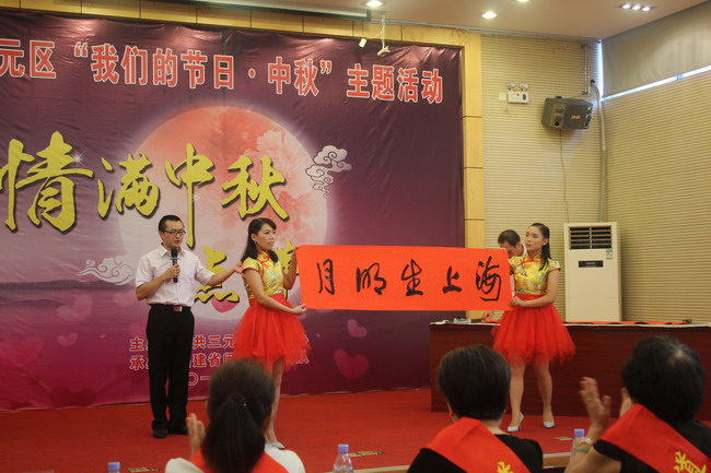 中秋节主题活动在《为三明点赞》的美好旋律中拉开帷幕。三元区委文明办主任林朝源向全体来宾致以节日的问候。他强调,中国传统节日凝聚着中华民族精神和民族情感及整个中华民族文化血脉乃至思想精华,是维系国家统一、民族团结和社会和谐的重要精神纽带,是建设社会主义先进文化的宝贵资源。举办“我们的节日”主题活动,让我们的传统文化、传统节日和传统习俗得以弘扬与传承。中秋节以团圆为主题,凝聚着中华传统文化的和谐精神。中秋月圆,象征着家庭和美,社会和顺,国家和平。通过本次活动表达对团圆佳节的期盼,对三明文明和谐的点赞,对身边好人的点赞,对干部职工和居民群众的节日问候,祝愿大家中秋快乐,幸福美满。