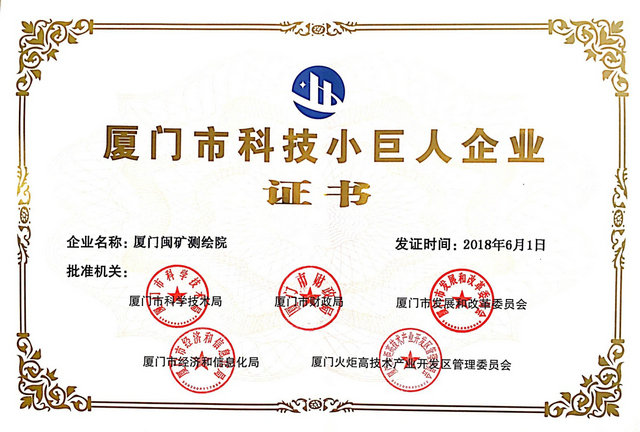 厦门市科技小巨人企业是指在研究、生产、开发、销售和管理的过程中,通过技术创新、管理创新、服务创新或模式创新取得核心竞争力,提供高技术产品和服务,具有较高成长性和发展潜力巨大的科技创新中小企业。经厦门科技局、财政局、发改委、经信局和火炬管委会五部门联合审核、评审、公布,具有相当的权威性与专业性,含金量十足。并进一步增强测绘院市场竞争力,进一步增强测绘院硬实力。