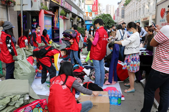 2015年11月29日下午,在中山路来雅百货门前的旧衣物接收点,队属地勘院、测绘院团员青年志愿者早早来到现场,按性别进行分工,女的主要负责现场衣服的整理、分类与打包,男的主要派送捐赠的旧衣物到现物,然后将打包好的衣物搬运至运输车辆或者仓库。