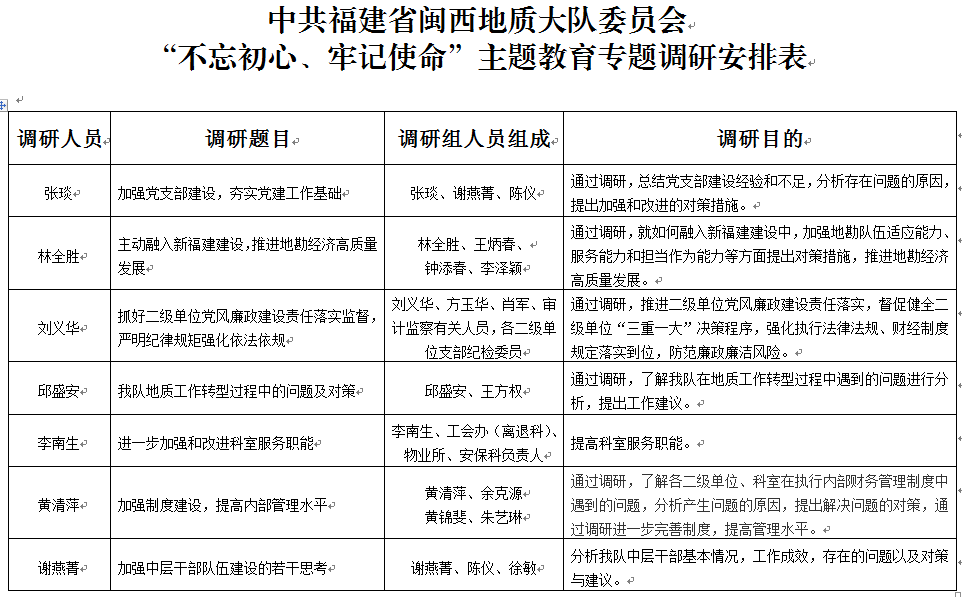 根据《中共福建省闽西地质大队委员会开展“不忘初心、牢记使命”主题教育工作方案》的部署安排,落实“坚持把深入调查研究贯穿始终”要求,制定如下调研工作方案。
